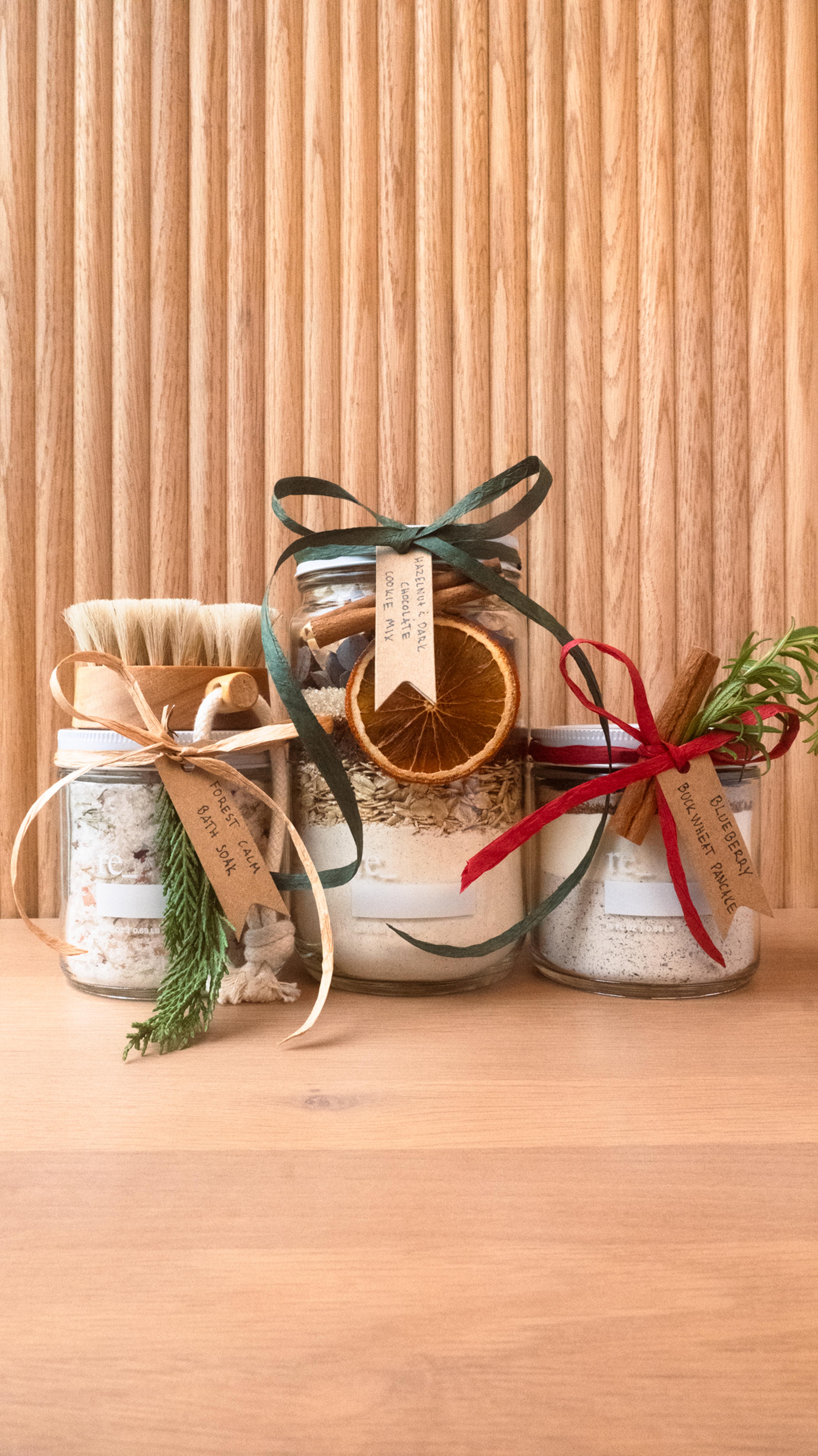Hazelnut & Dark Chocolate Cookie Mix, Forest Calm Bath Soak & Blueberry Buckwheat Pancake Mix gifted in re_ grocery glass jars